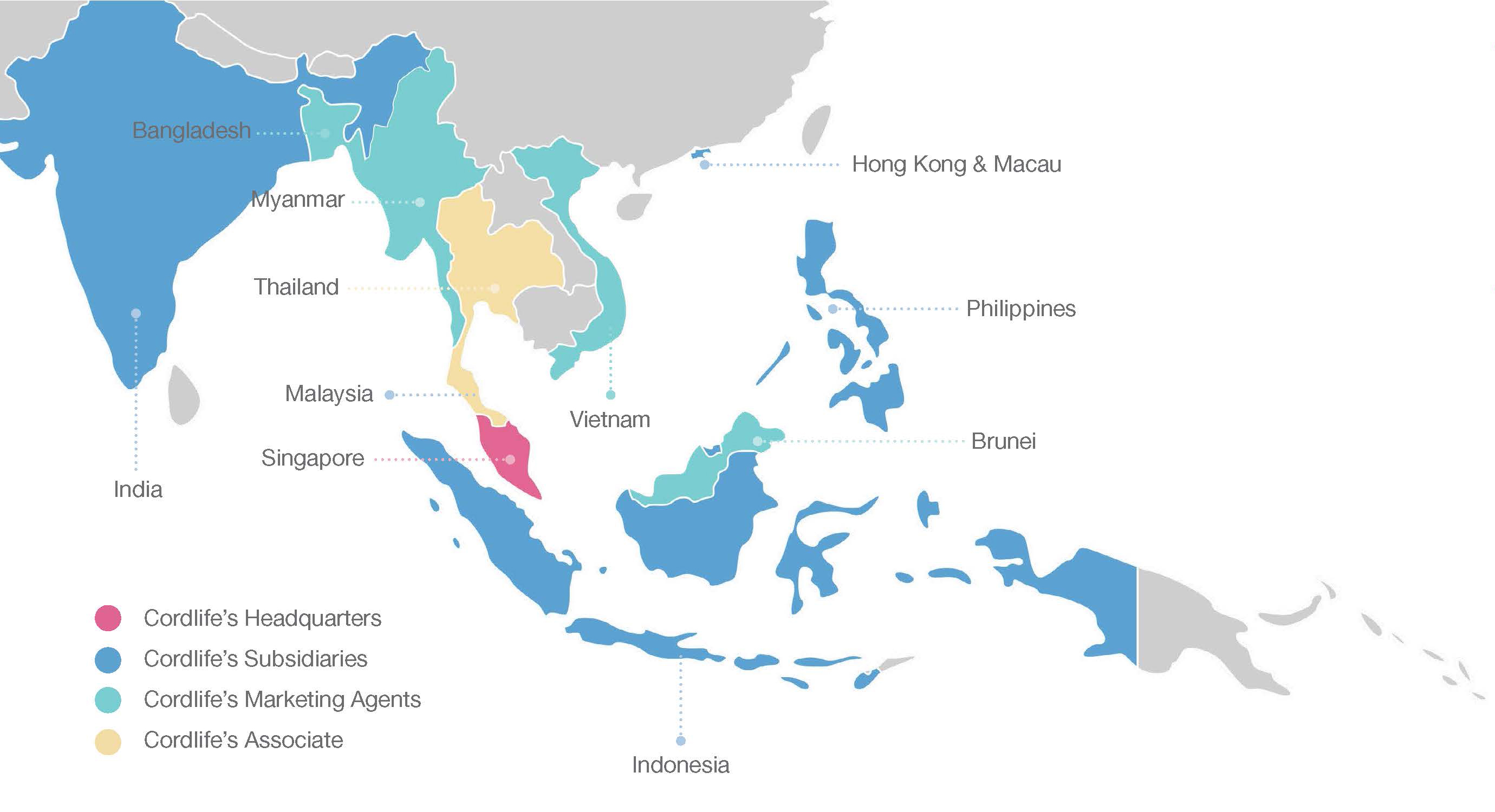 - Cordlife Group Limited, a Singapore Exchange Mainboard-listed company since 2001, has presence in several Asian countries including Singapore, Philippines, Hong Kong and Macau, India, Indonesia, Malaysia, Thailand, Myanmar, Vietnam, Bangladesh, and Brunei.